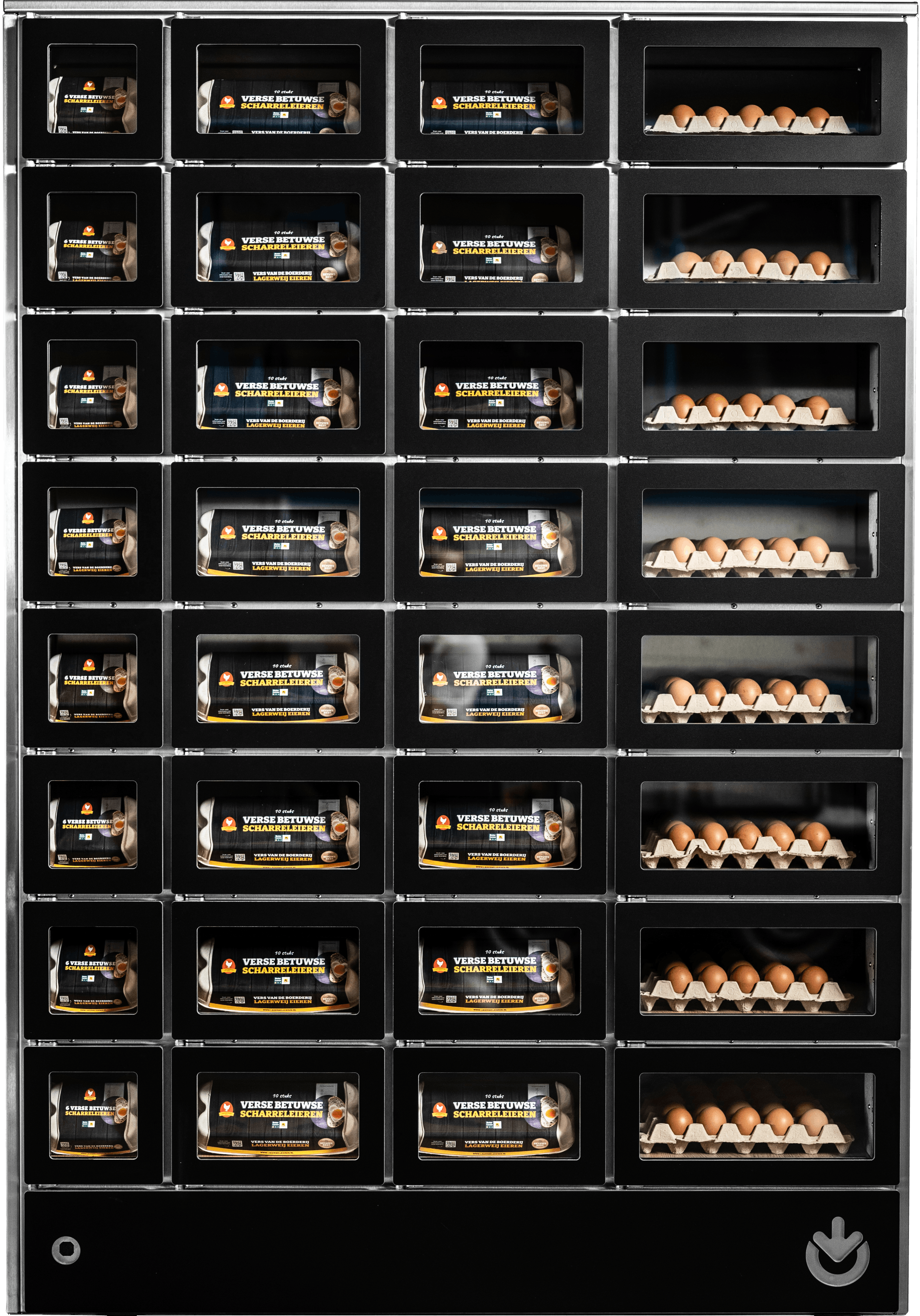 Agromaat maakt makkelijker dan ooit om boerderijproducten te kopen. Jouw klanten kiezen eenvoudig producten uit via een groot, centraal display. Vervolgens rekenen ze in één keer de volledige bestelling af via de pinterminal. Daarna gaan de luikjes van de verschillende automaten open en kunnen ze de producten uitnemen. In tegenstelling tot bij andere boerderijautomaten is het dus niet nodig om meerdere keren af te rekenen. Wel zo gemakkelijk én snel!